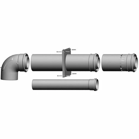 für Brennwertgeräte, Abgasleitung mit waagerechter konzentrischer Anschlussleitung, für Schachteinbau und Anschluss an feuchteunempfindlichen LAS, raumluftabhängig, als Bausatz, bestehend aus: Revisionsbogen-T-Stück 87° konzentrisch, Rohr konzentrisch 500 mm, Rosette, Rohr konzentrisch 250 mm, Abgasrohr 500 mm