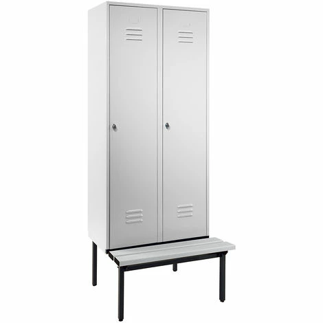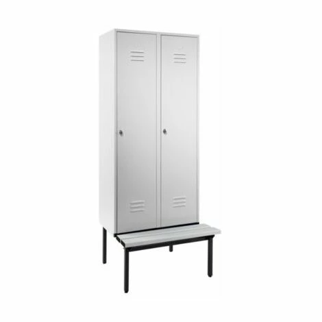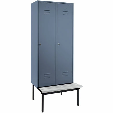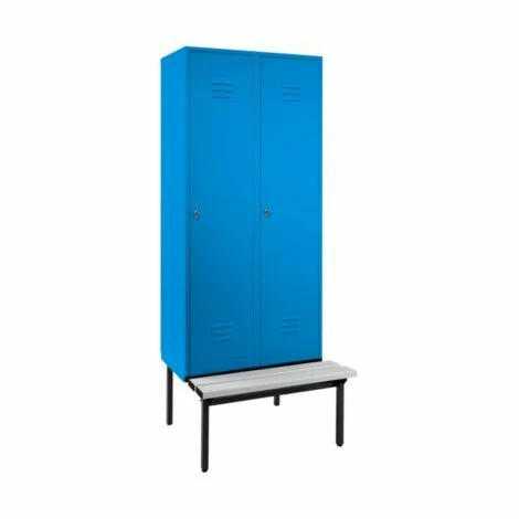 Abteilbreite: 400 mm, Anzahl Abteile: 2, Breite: 800 mm, Höhe: 2135 mm, Schranktiefe: 500 mm, Sitzhöhe: 400 mm, Sitztiefe: 300 mm, Staffelpreisvorteil ab: 1 Stück, Tastaturplatte: 0, Tiefe: 800 mm, Gestellfarbe: anthrazitgrau RAL 7016, Innenausstattung: 1 Hutablage, 1 Kleiderstange mit 4 Haken, Korpusfarbe: Lichtblau Ral 5012, Leistenmaterial: PVC, Material: Stahlblech geschweisst, Preiseinheit: Stück, Türart: Vollwand-Türen, Türfarbe: lichtblau RAL 5012, Verschlussart: Doppelbartschloss mit 2 Schlüsseln