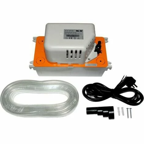 mit potentialfreiem Alarmausgang, steckerfertig, bestehend aus: Kondensatpumpe, Kondensattank mit Deckel und Wandhalterung, PVC-Schlauch 10 mm (6 m lang), Rückschlagventil, Kondensatzulauf-Adapter