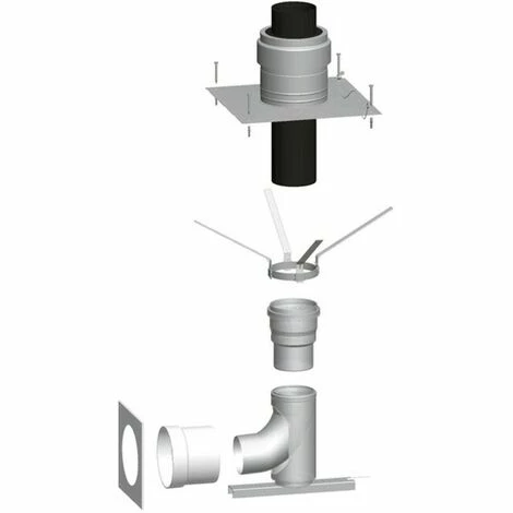 raumluftabhängig, bestehend aus: Schachtabdeckung DN 125 (Polypropylen) mit Mündungsrohr (Polypropylen, schwarz), 6x Abstandshalter DN 125 (Polypropylen), Erweiterung DN 110 auf Muffe DN 125 (Polypropylen), Stützbogen 87° DN 110 (Polypropylen) mit Abstützung, Wandfutter DN 110/160 (Edelstahl), Mauerblende DN 160 (Edelstahl), Gleitmittel-Tube 50 ml