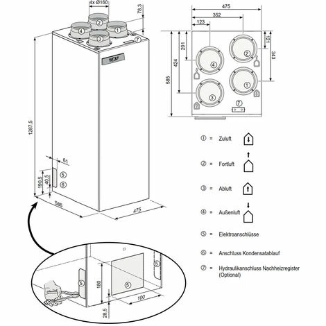 - Elektr. Vorheizregister 1000W im Gerät integriert