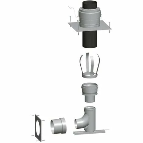 raumluftunabhängig, bestehend aus: Schachtabdeckung DN 160 (Polypropylen) mit Mündungsrohr (Polypropylen schwarz), 6x Abstandhalter DN 160 (Polypropylen), Erweiterung DN 110 auf Muffe DN 160 (Polypropylen), Stützbogen 87° DN 110 (Polypropylen) mit Abstützung, Wandfutter DN 110/160 (Edelstahl), Mauerblende DN 160 (Edelstahl), Gleitmittel-Tube 50 ml