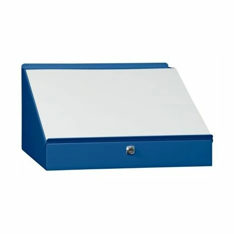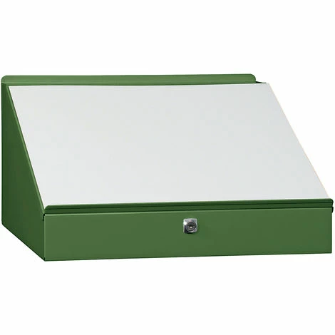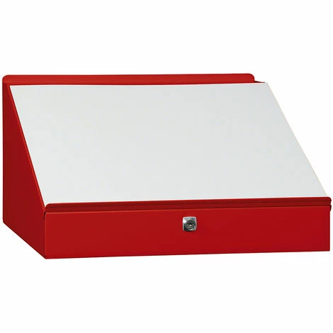 Aufsetzbar auf die Schränke. Schreibfläche mit Holzauflage, oben und unten mit Abrollrand, Bleistiftablage. Pultdeckel zum Öffnen, geräumiger Innenraum, abschließbar durch Sicherheits-Zylinderschloss.