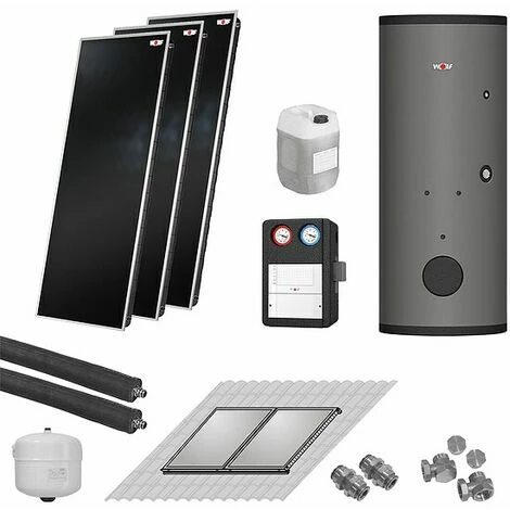 Wolf Thermische Solaranlage (Bruttoabsorberfläche 6,9 m²) mit 3 Stück Hochleistungs-Sonnenkollektoren F3-1 und Warmwasser-Solarspeicher SEM-2-400, bestehend aus: