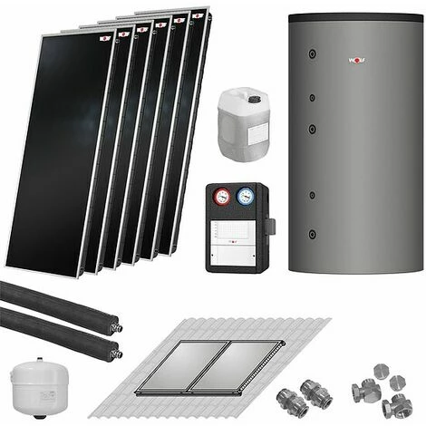 Wolf Thermische Solaranlage (Bruttoabsorberfläche 13,8 m²) mit 6 Stück Hochleistungs-Sonnenkollektoren F3-1 und Pufferspeicher BSH-1000, bestehend aus: