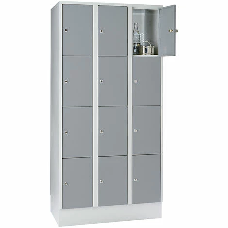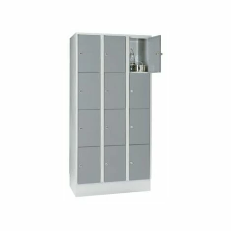Abteilbreite: 300 mm, Anzahl Fächer: 12, Breite: 900 mm, Fachbodenhöhe: 410 mm, Fachbreite: 300 mm, Höhe: 1800 mm, Sockelhöhe: 100 mm, Staffelpreisvorteil ab: 1 Stück, Tastaturplatte: 0, Tiefe: 500 mm, Innenausstattung: Fächer ohne Unterteilung, Korpusfarbe: lichtgrau, Material: Stahlblech geschweisst, Türart: Vollwand-Türen, Verschlussart: Doppelbartschloss mit 2 Schlüsseln