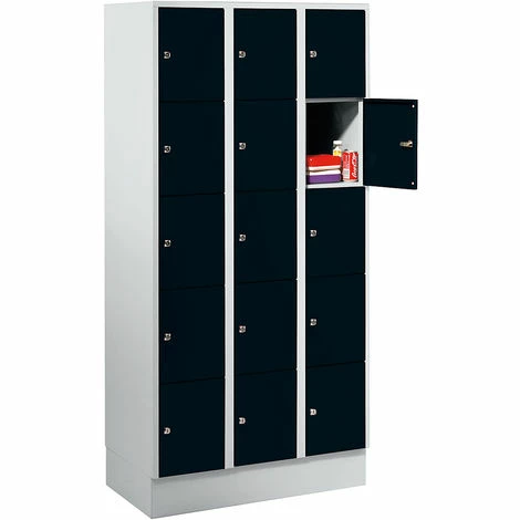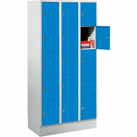 Abteilbreite: 300 mm, Anzahl Abteile: 15, Breite: 900 mm, Fachbodenhöhe: 320 mm, Fachbreite: 300 mm, Höhe: 1850 mm, Sockelhöhe: 100 mm, Staffelpreisvorteil ab: 1 Stück, Tastaturplatte: 0, Tiefe: 500 mm, Ausführung Spindgestell: mit Bodensockel, Innenausstattung: ohne Ausstattung, Korpusfarbe: lichtgrau, Material: Stahlblech, punktgeschweißt, Preiseinheit: Stück, Türart: Vollwand-Türen, Türfarbe: enzianblau RAL 5010, Verschlussart: Sicherheitszylinderschloss mit 2 Schlüsseln