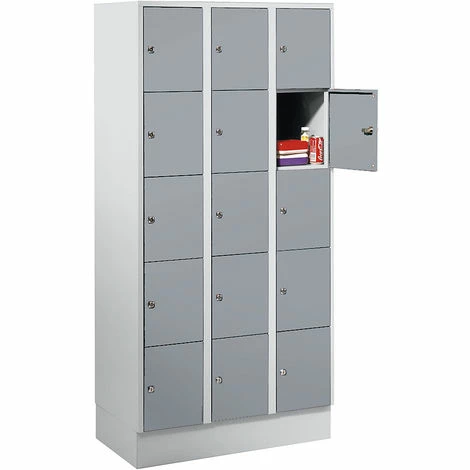 Abteilbreite: 300 mm, Anzahl Fächer: 15, Breite: 900 mm, Fachbodenhöhe: 320 mm, Fachbreite: 300 mm, Höhe: 1800 mm, Sockelhöhe: 100 mm, Staffelpreisvorteil ab: 1 Stück, Tastaturplatte: 0, Tiefe: 500 mm, Innenausstattung: Fächer ohne Unterteilung, Korpusfarbe: lichtgrau, Material: Stahlblech geschweisst, Türart: Vollwand-Türen, Verschlussart: Doppelbartschloss mit 2 Schlüsseln