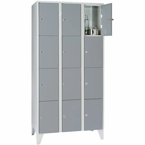 Stahlspind, mit Stollenfüßen, 12 Fächer, 300 mm, lichtgrau silbergrau. Optimale Raumnutzung durch Aufsatzschränke (siehe Zubehör). Mit Zylinderschloss abschließbar. Praxisgerechte Ausstattungsvarianten. Aus Stahlblech geschweißt. Korpus immer in Lichtgrau RAL 7035. Leicht zu reinigen. Alle Türen mit Sicherheitszylinderschloss. Mit den passenden Aufsatzschränken können Sie Ihr Stauraumvolumen zusätzlich erhöhen. Türfarbe Basaltgrau RAL 7012 auf Anfrage.