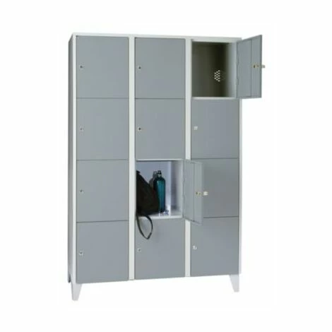 Abteilbreite: 400 mm, Anzahl Fächer: 12, Breite: 1200 mm, Fachbodenhöhe: 410 mm, Fachbreite: 300 mm, Höhe: 1850 mm, Staffelpreisvorteil ab: 1 Stück, Tastaturplatte: 0, Tiefe: 500 mm, Innenausstattung: Fächer ohne Unterteilung, Korpusfarbe: lichtgrau, Material: Stahlblech geschweisst, Türart: Vollwand-Türen, Verschlussart: Doppelbartschloss mit 2 Schlüsseln
