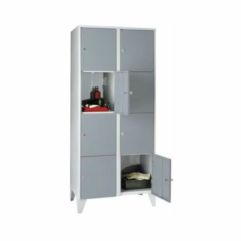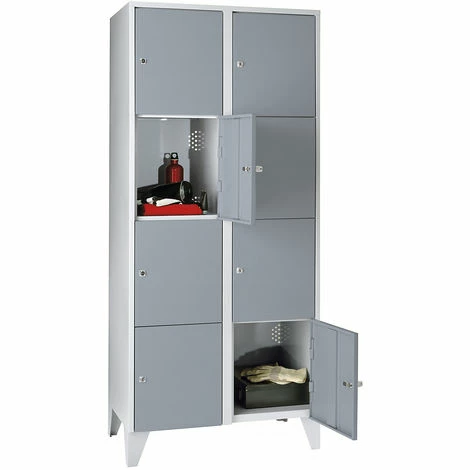 Stahlspind, mit Stollenfüßen, 8 Abteile, 400 mm, lichtgrau silbergrau. Optimale Raumnutzung durch Aufsatzschränke (siehe Zubehör). Mit Zylinderschloss abschließbar. Praxisgerechte Ausstattungsvarianten. Aus Stahlblech geschweißt. Korpus immer in Lichtgrau RAL 7035. Leicht zu reinigen. Alle Türen mit Sicherheitszylinderschloss. Mit den passenden Aufsatzschränken können Sie Ihr Stauraumvolumen zusätzlich erhöhen. Türfarbe Basaltgrau RAL 7012 auf Anfrage.
