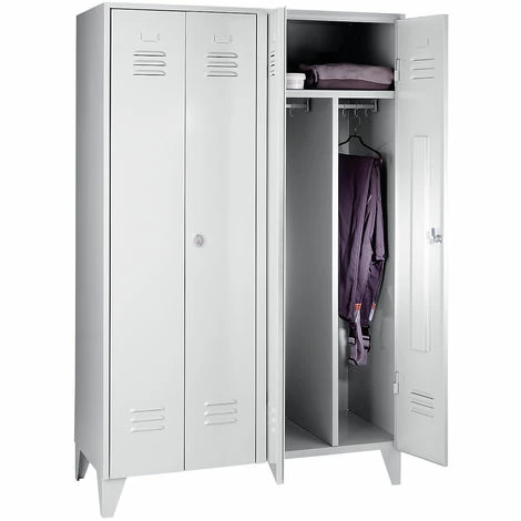 Schrankhöhe mit Stollenfüßen 1850 mm, mit Sockel 1800 mm. Vollwand-Türen mit Lüftungsschlitzen.